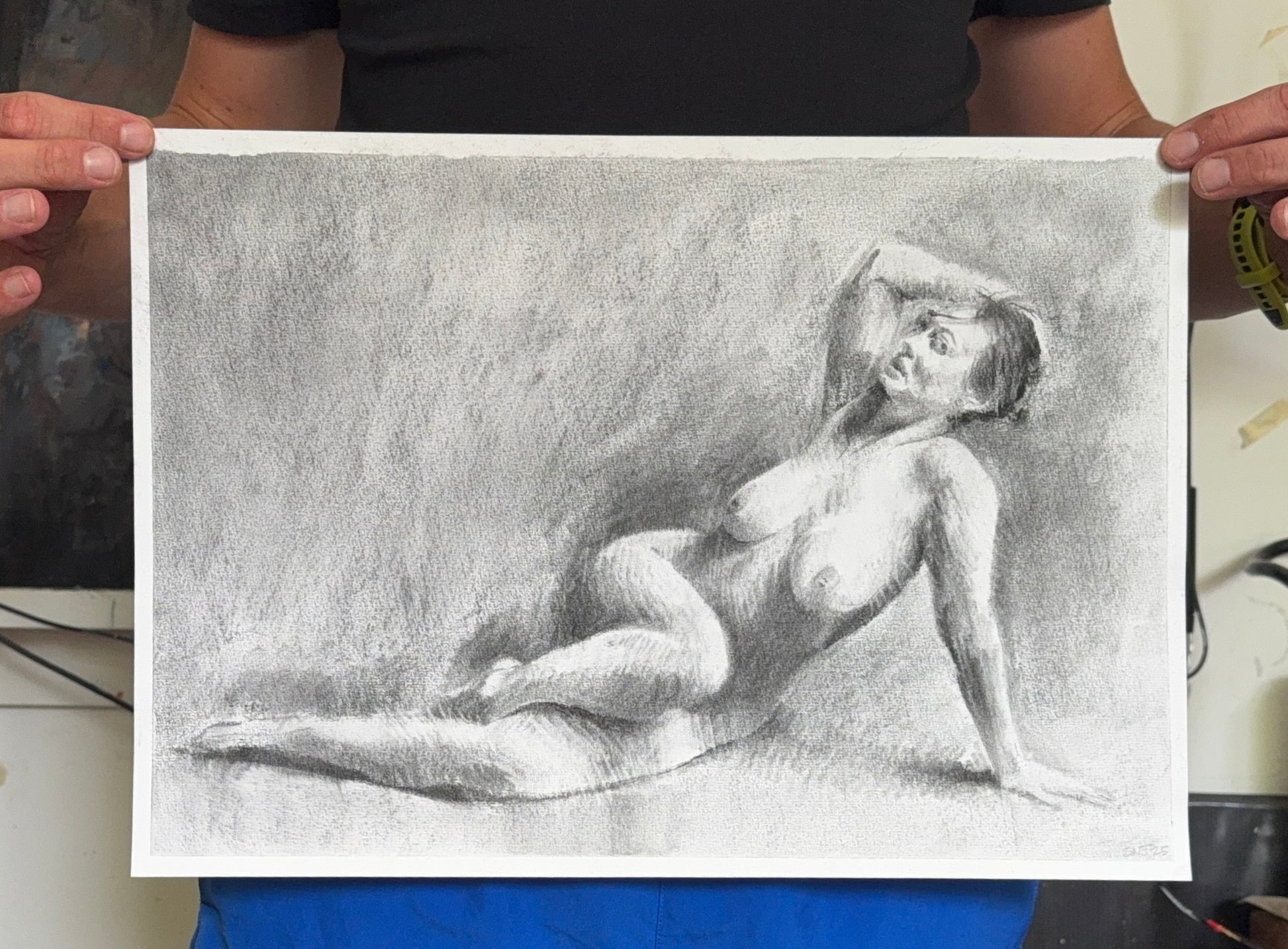 This is an original, signed, one-off charcoal life drawing on A3 paper. It captures the strength and sensitivity of the human form with expressive mark-making, rich tonal contrasts, and a strong sense of atmosphere.
