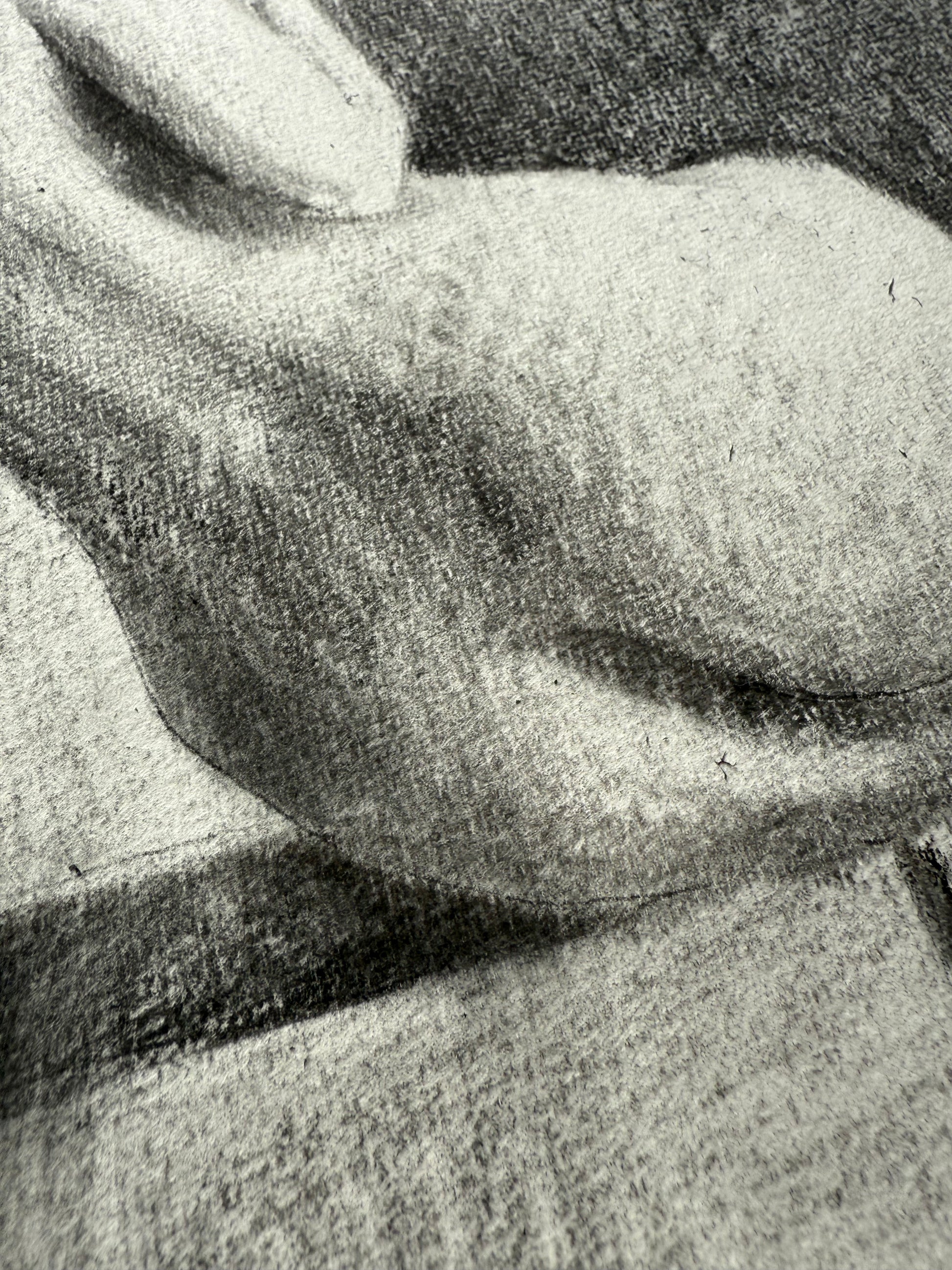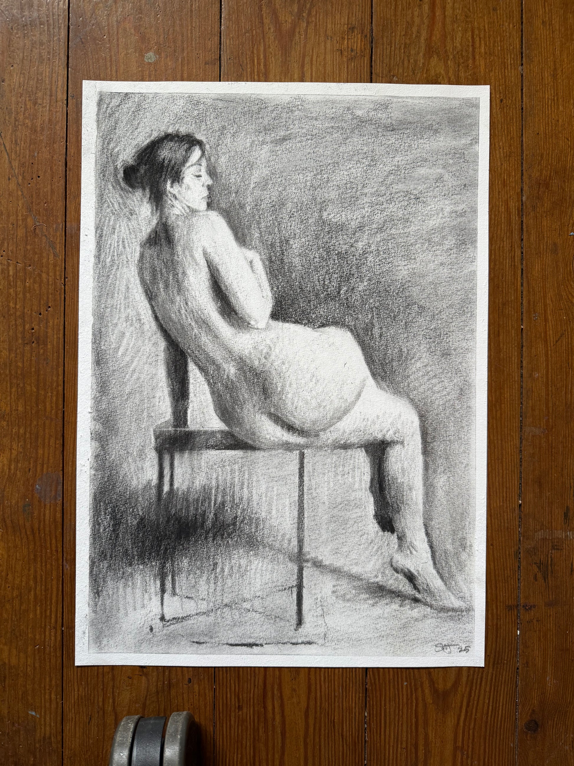 This is an original, signed, one-off charcoal life drawing on A3 paper. It captures the strength and sensitivity of the human form with expressive mark-making, rich tonal contrasts, and a strong sense of atmosphere.
